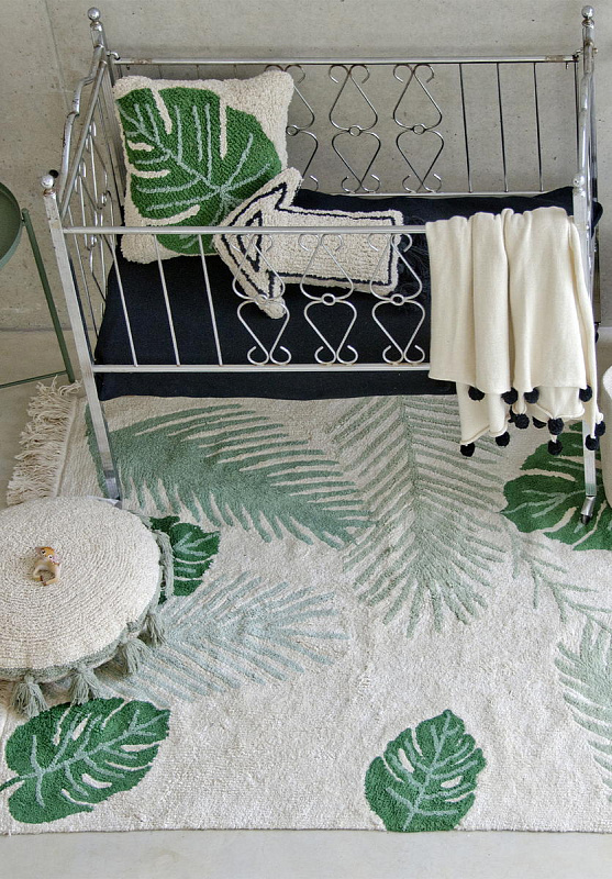 Подушка Lorena Canals Монстера 38х38 см выполнена из хлопка и также, как ковры, легко стираются в машинке, ведь подушки в детской часто используются не только, как элементы декора, но и для игры.