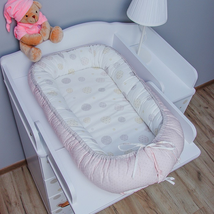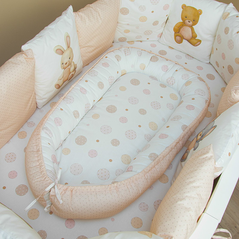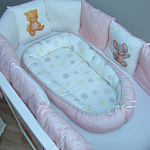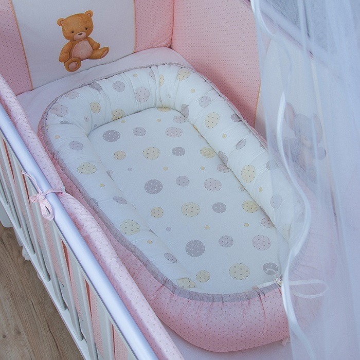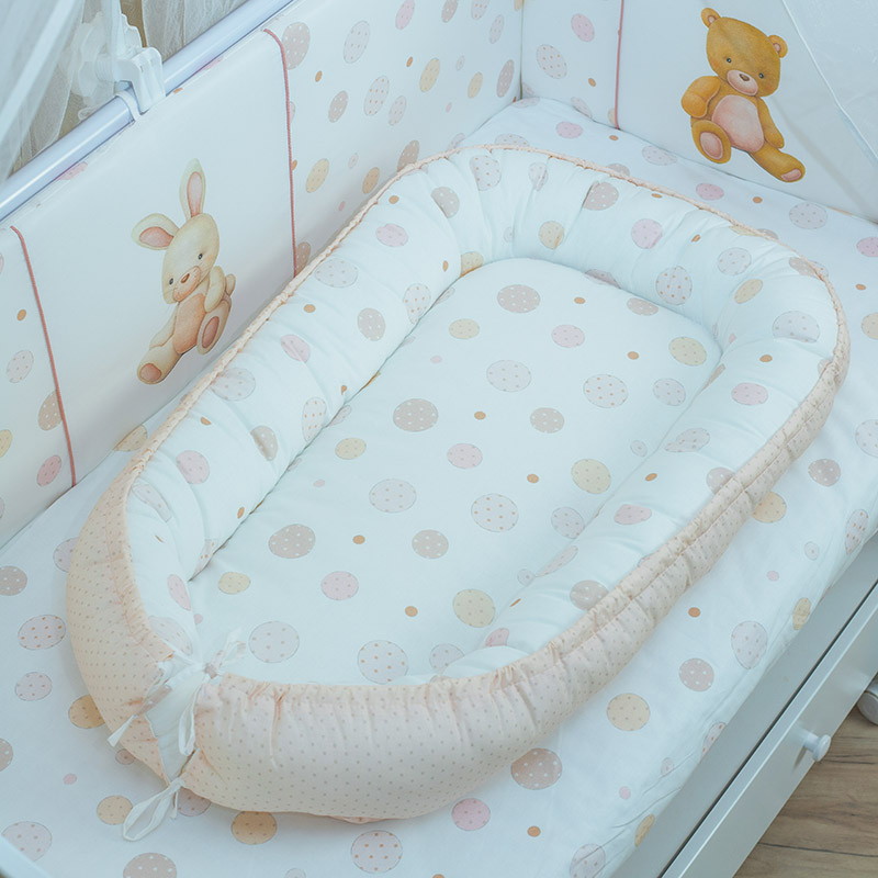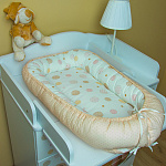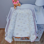 Подушка-гнездышко Vikalex Мишкина компания - это приятный и здоровый сон для вашего малыша. Подушка выполнена в бежевом цвете с рисунком изящных пузырьков в тёплых оттенках и с милым белым бантиком на ободке. Наша подушка-гнездышко сделана из качественных материалов, поэтому обеспечит младенца комфортом и уютом во время сна. Очень практична и удобна в использовании. Вы можете брать подушку с собой в путешествия, в гости, на прогулку, либо использовать её в других назначениях.