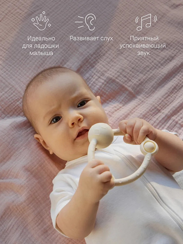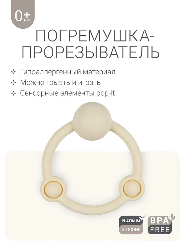 У лёгкой погремушки в виде кольца — эргономичная форма, которая идеально подходит для детских ладошек. Рельефная поверхность массирует дёсны при кусании, но не повреждает их, выполняя функцию прорезывателя. Игрушка развивает моторику и сенсорное восприятие, а элементы pop-it на погремушке-кольце делают игру с ней ещё увлекательнее. Погремушка из гипоаллергенного силикона издаёт успокаивающий звук и развивает ребенка через игру. Спокойные цвета игрушки гармонично впишутся в домашний интерьер.