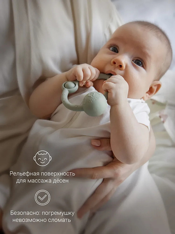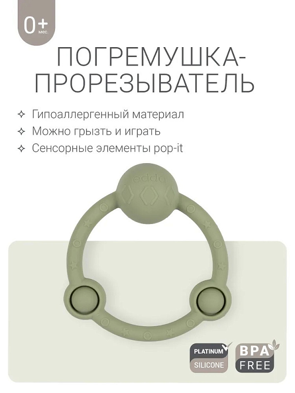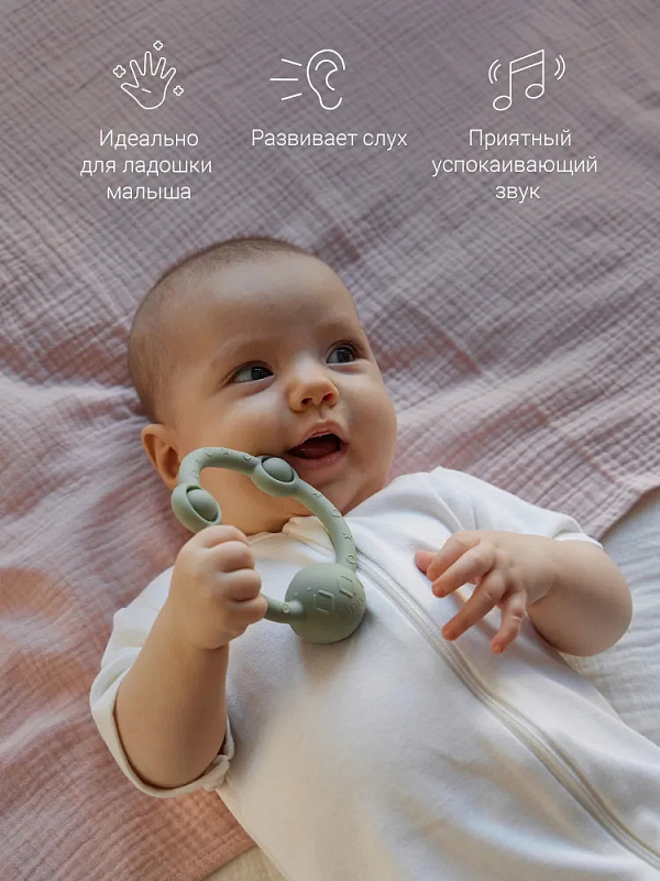 У лёгкой погремушки в виде кольца — эргономичная форма, которая идеально подходит для детских ладошек. Рельефная поверхность массирует дёсны при кусании, но не повреждает их, выполняя функцию прорезывателя. Игрушка развивает моторику и сенсорное восприятие, а элементы pop-it на погремушке-кольце делают игру с ней ещё увлекательнее. Погремушка из гипоаллергенного силикона издаёт успокаивающий звук и развивает ребенка через игру. Спокойные цвета игрушки гармонично впишутся в домашний интерьер.