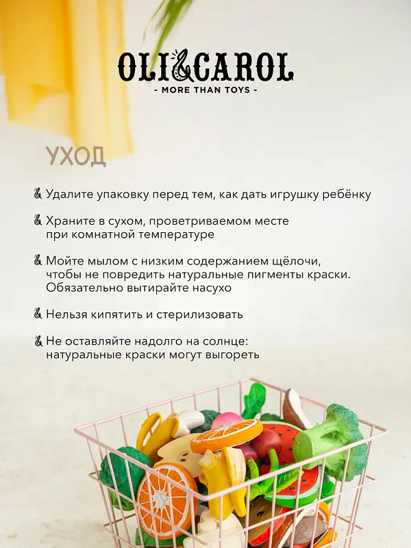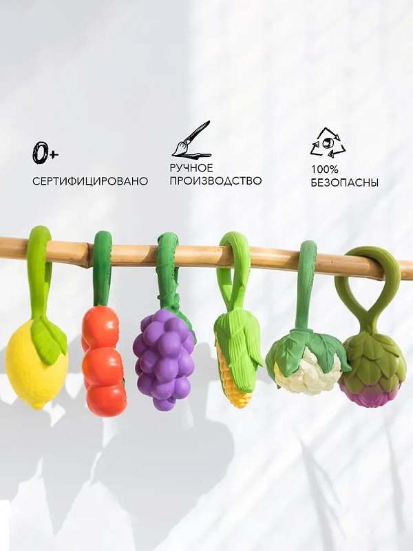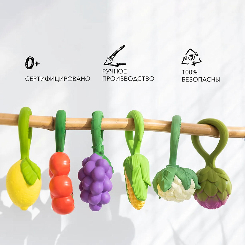 Коллекция погремушек-прорезывателей в виде фруктов и овощей от бренда Oli&Carol – это экологичные игрушки 2-в-1 из натурального каучука, окрашенные вручную пищевыми красителями и наполненные переработанными косточками вишни. Приятный звук погремушки успокаивает и не вызывает перевозбуждения у детей.