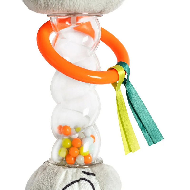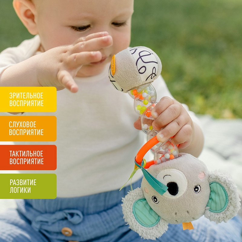 Красочные цвета стимулируют зрение ребенка. Звук перекатывающихся бусин и пищалка тренируют слух. Игра с погремушкой активизирует логику и двигательную активность. Ткань разнообразной фактуры, шуршащие элементы и рельеф погремушки способствуют развитию тактильного восприятия и мелкой моторики.
