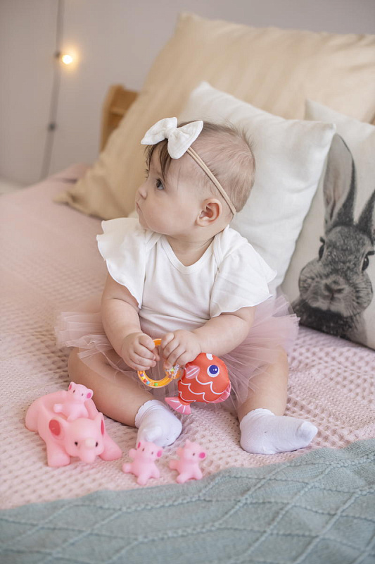Яркие морские обитатели будут привлекать внимание малыша, а звуковое сопровождение развивать слуховые навыки, ведь внутри игрушки спрятана еще и пищалка.