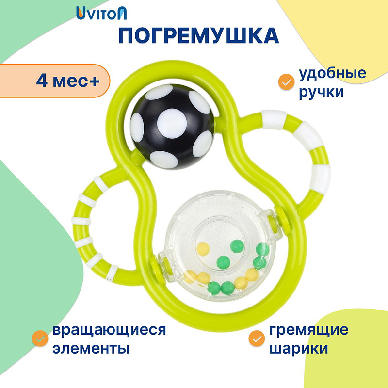 Погремушки серии Uviton отличаются прекрасным дизайном и высоким качеством применяемых для изготовления материалов. Играя с погремушкой, ребенок развивает моторику пальцев, внимание, наблюдательность, координацию движений, слуховые и зрительные навыки. Перед началом использования необходимо промыть игрушку в теплой воде с мылом.