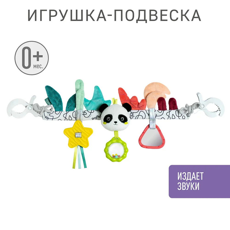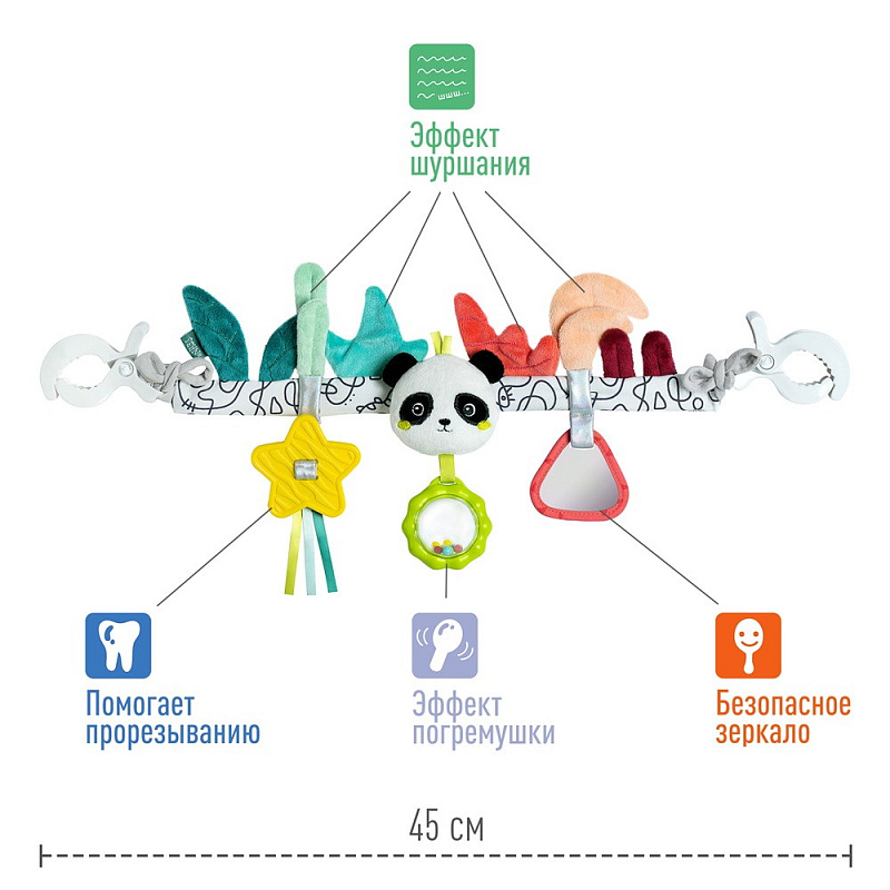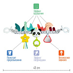 Игрушки пробуждают любопытство ребенка – малыш будет тянуться к ним, тренируя зрительно-моторную координацию и хватательный навык. Панда пищит от легкого нажатия, прозрачный шар-погремушка наполнен разноцветными бусинами, звук которых стимулирует слух. Прорезыватель-звёздочка успокоит дёсны в период прорезывания зубов. Разные фактуры ткани и шуршащие элементы приятно мять и сжимать, тем самым стимулируя тактильное восприятие. В зеркальце интересно рассматривать свое отражение.