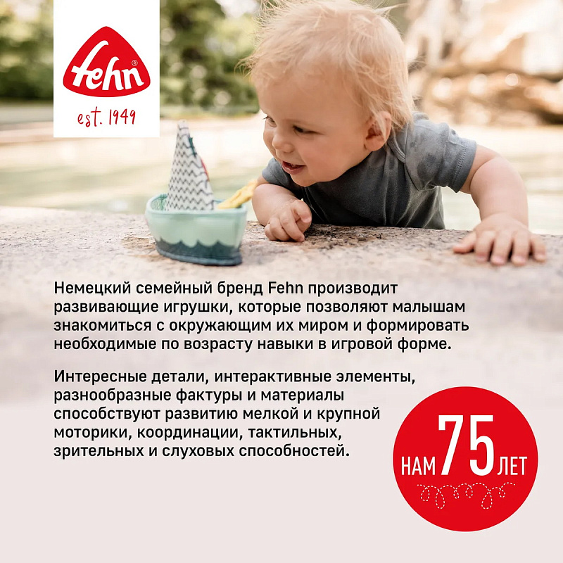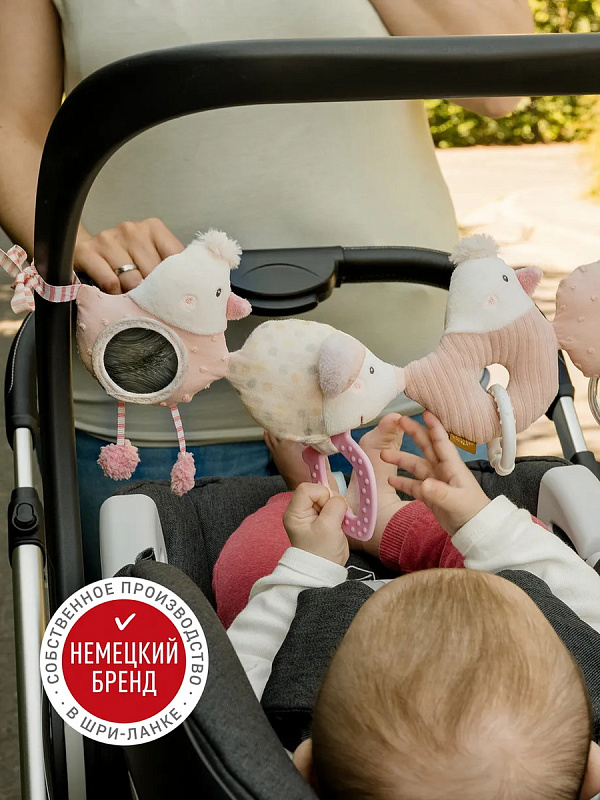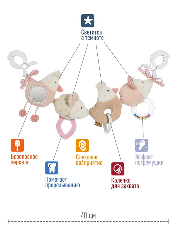 Шуршащие элементы и фактура ткани развивают тактильное восприятие и мелкую моторику, погремушка и пищалка стимулируют слух, а в зеркальце интересно рассматривать своё отражение. Светящиеся элементы на погремушке помогают избавить малыша от страха темноты.