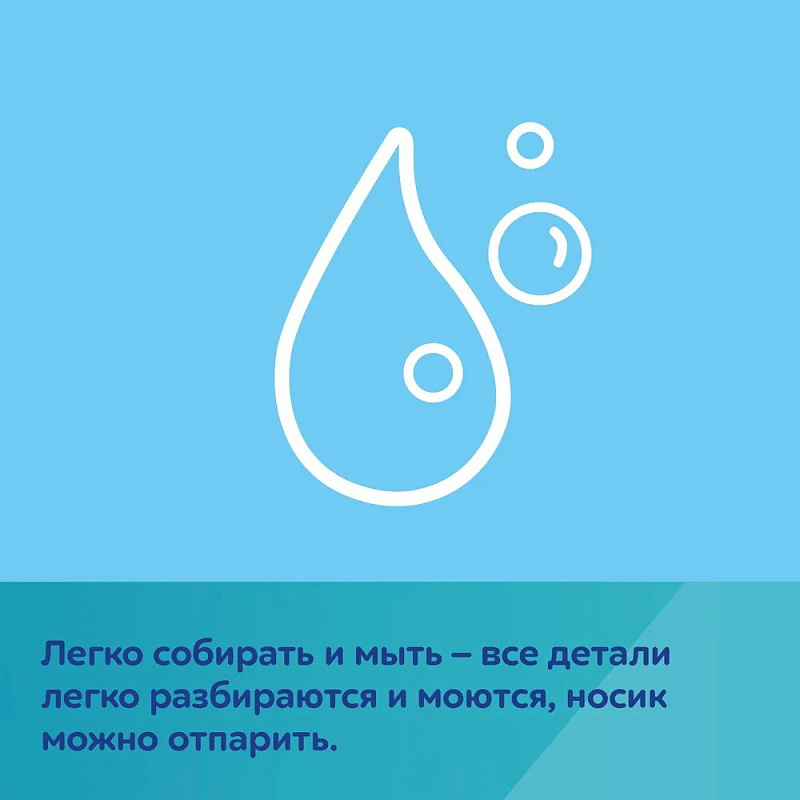 Легко собрать и мыть – носик легко выдвигается, а в поильнике нет лишних закоулков, поэтому все детали можно быстро вымыть. Носик можно отпарить.
