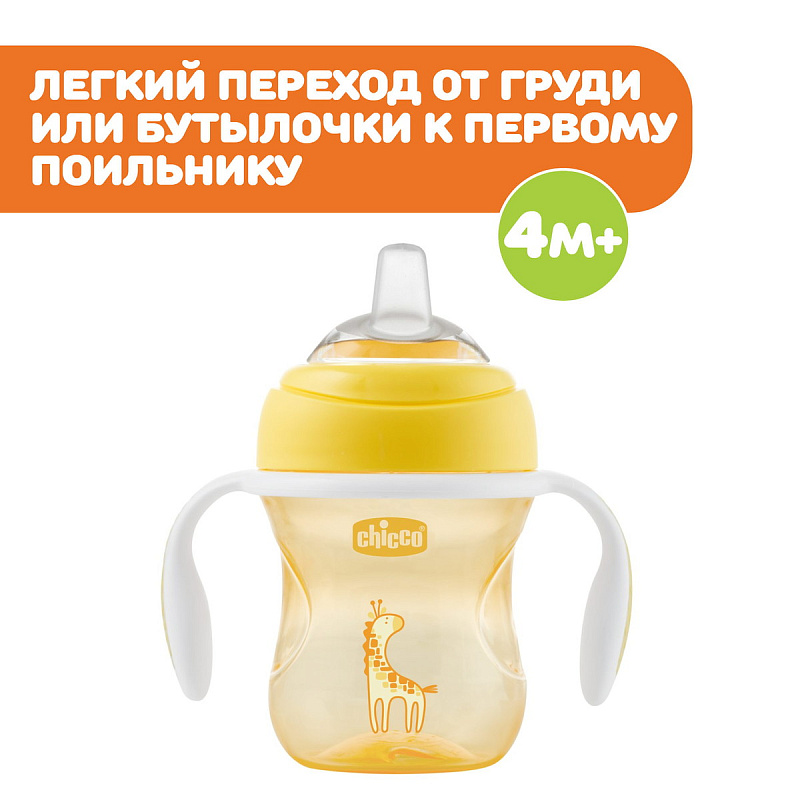 Поильник Chicco Transition Cup (200 мл) - первый этап в переходе от бутылочки к самостоятельному питью. Чашка-поильник с мягким силиконовым носиком предназначена для детей от 4 месяцев.