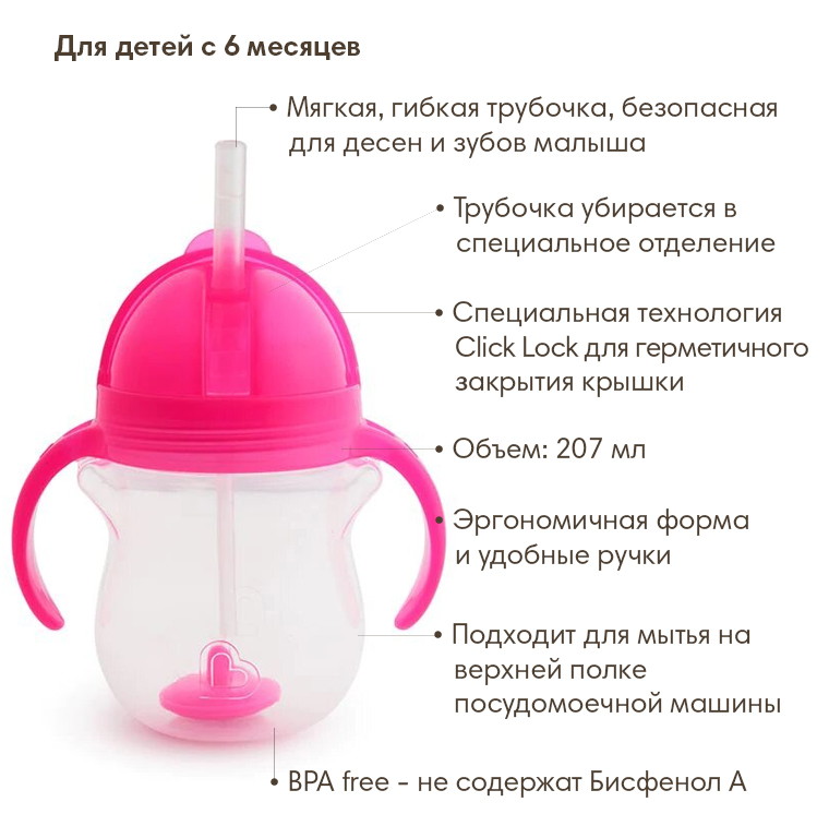 Поильник Munchkin Click Lock Any Angle с трубочкой и ручками 6+ 207 мл. 11888/12482 розовый1 оценкаХарактеристики