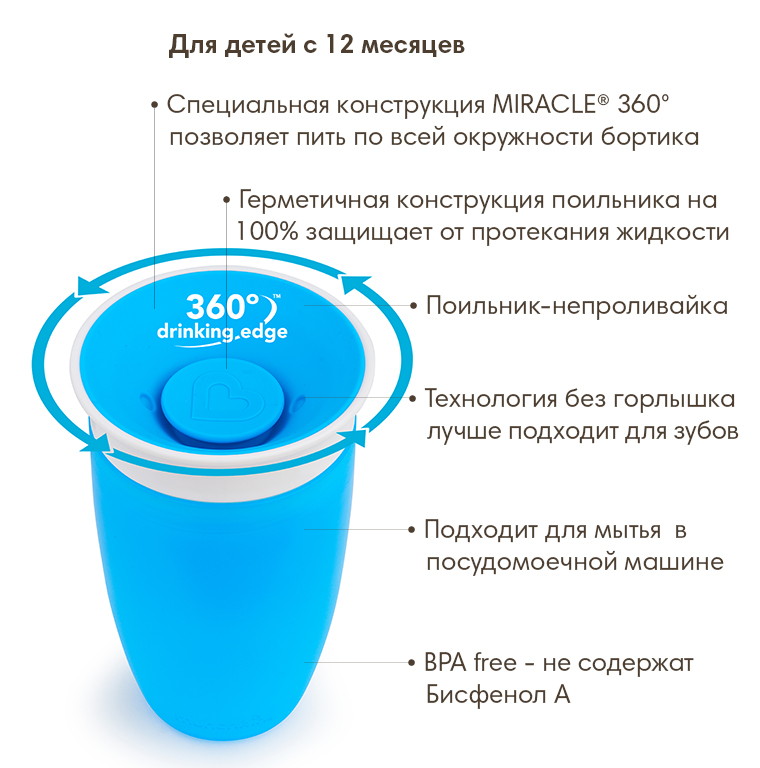 Поильник непроливайка Munchkin Miracle 360° 296 мл. с 12 мес. 12096/11028 BU голубойНет оценокХарактеристики
