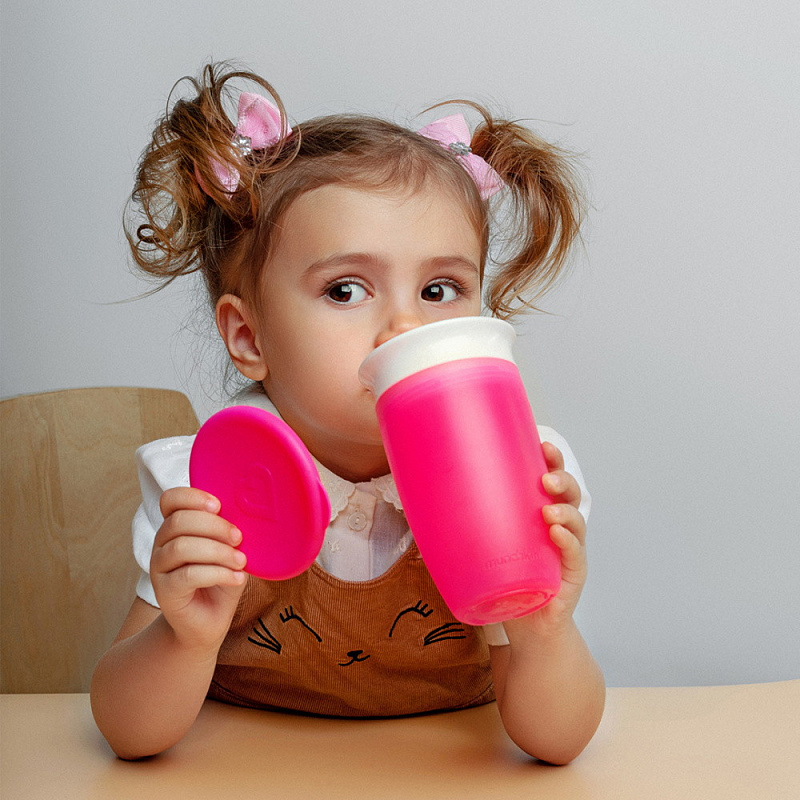 В наборе с поильником MIRACLE® 360° крышка, которая надежно защитит бортик поильника от грязи. Конструкция крышки позволяет "защелкнуть" бортик поильника, чтобы гарантировать его чистоту. Возьмите такую крышку с собой в путешествие или на прогулку и не думайте о том, чтобы каждый раз перед питьем протирать бортик поильника. Поильник Munchkin MIRACLE® 360° создан с учетом потребностей как детей, так и родителей. Он предотвращает любые проливания напитка, а благодаря мягкому и гибкому материалу бережет зубы и десны малыша. Пить свой напиток малыш может по всей окружности - жидкость равномерно распределится под крышкой, под каким бы углом ребёнок не наклонил поильник. А еще поильник Munchkin MIRACLE® 360° помогает поддерживать нормальное развитие мышц во рту малыша. Никаких дополнительных носиком, соломинок и прочего, - поильник Munchkin MIRACLE® 360° прост в использовании и мытье. Из него можно пить сидя, на ходу и даже лежа!