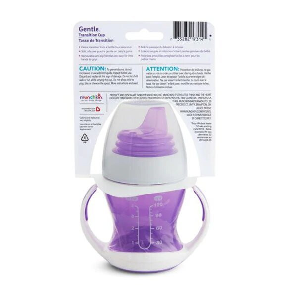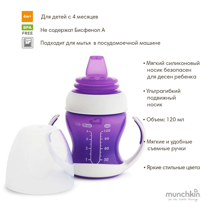 Поильник-чашка Munchkin Gentle обучающий, с ручками 4+ 120 мл. 11143/12550 фиолетовыйНет оценокХарактеристики