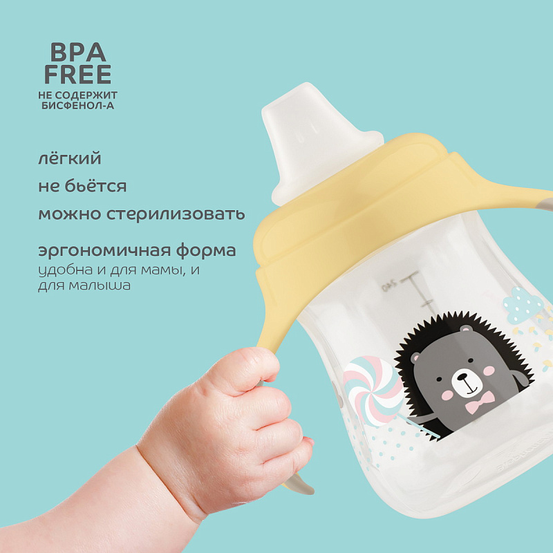 Поильник-непроливайка c мягким силиконовым носиком подходит для детей, которые только учатся пить самостоятельно. Принцип питья из поильника с мягким носиком схож с питьем из бутылочки или при грудном вскармливании, поэтому ребенок быстро поймет, как им пользоваться. Поильник легкий и не бьющийся, имеет эргономичные ручки, которые обучают ребенка правильно держать поильники пить без посторонней помощи. Прозрачность поильника и мерная шкала позволяют контролировать количество жидкости, которое ребенок выпивает. Колпачок защищает носик от загрязнения, позволяет брать поильник на прогулку, а открыть его можно одной рукой, надавив на углубление в колпачке. Изготовлен из безопасных материалов, не содержащих бисфенол-А.