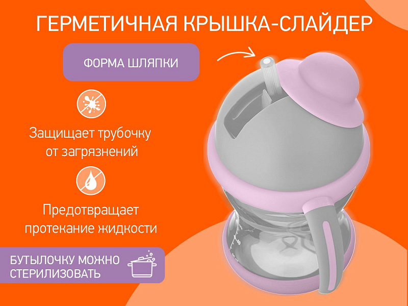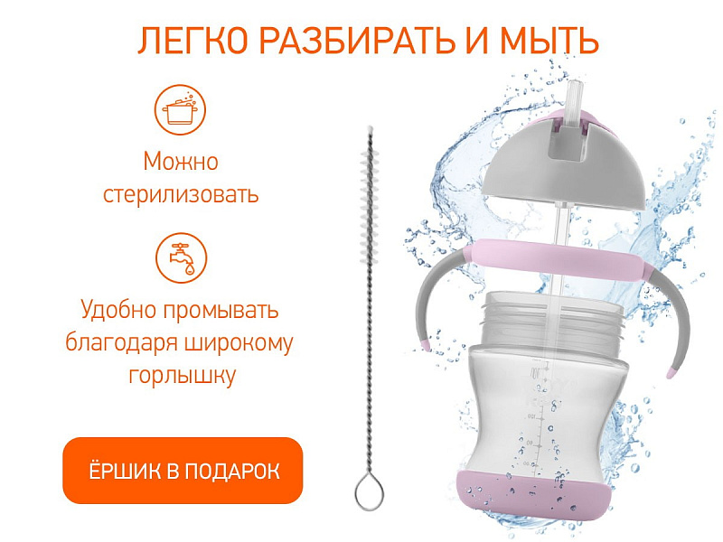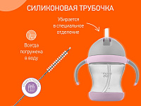 Тренировочный поильник-непроливайка поможет малышу научиться пить самостоятельно и привыкнуть к использованию обычной чашки. Изогнутая нижняя часть трубочки всегда погружена в жидкость вне зависимости от положения поильника, поэтому малыш будет оставаться в естественном положении во время питья. Трубочка сделана из мягкого силикона и не повреждает чувствительные десны и зубки ребенка. Защелкивающаяся крышка-слайдер в форме шляпки предотвращает протекание жидкости во время переноски и помогает сохранять трубочку в чистоте. Прочные прорезиненные ручки разработаны специально для малышей и имеют удобную для захвата форму. Изделие подходит для использования дома, на прогулках и в путешествиях. Яркий дизайн привлечет внимание малыша и сделает процесс кормления веселым и беззаботным! Поильник легко разбирается и моется. В комплект входит ёршик для трубочки. Можно мыть в посудомоечной машине.