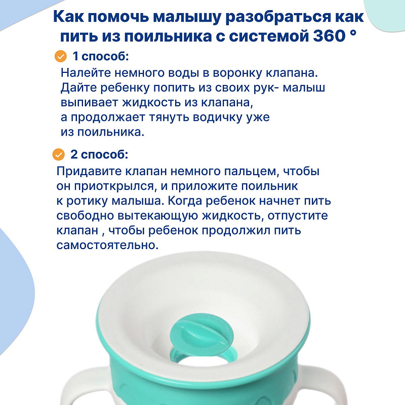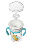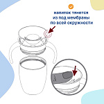 Конструкция носика позволяет пить малышу с любой стороны (360 ̊) по всей окружности, жидкость равномерно распределится под крышкой, под каким бы углом ребёнок не наклонил поильник. А силиконовая вставка внутри предотвращает любые проливания жидкости. Благодаря мягкому и гибкому материалу носика бережет зубы и десны малыша. Для удобства захвата поильник имеет две ручки. В комплекте с поильником идет крышка для защиты от протекания и загрязнения. Отлично подойдет для путешествий и прогулок.