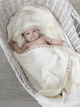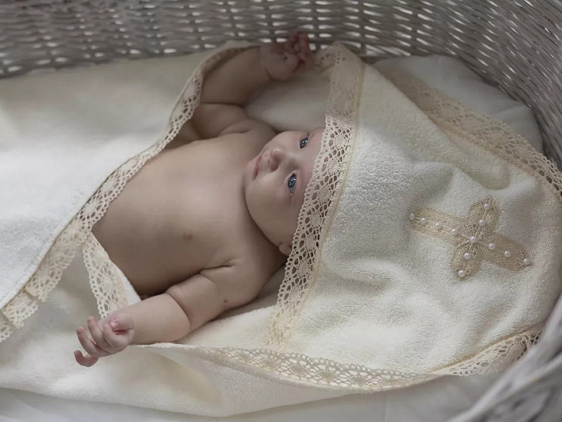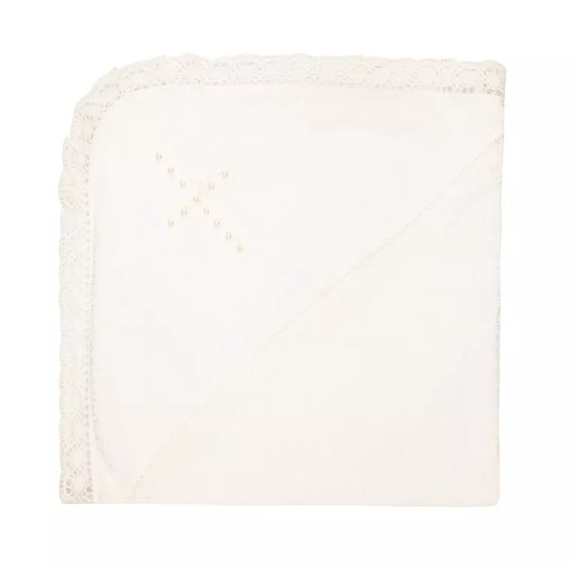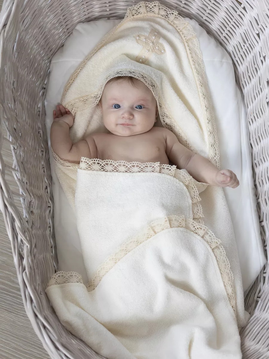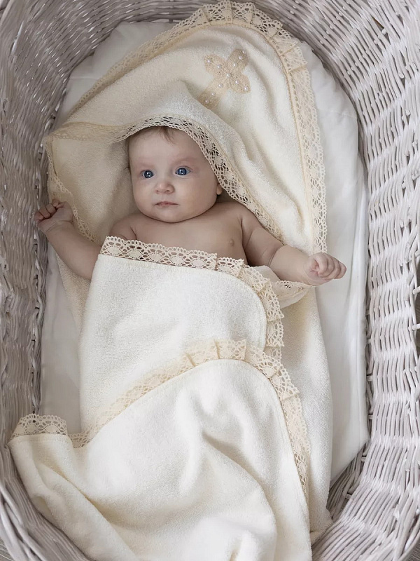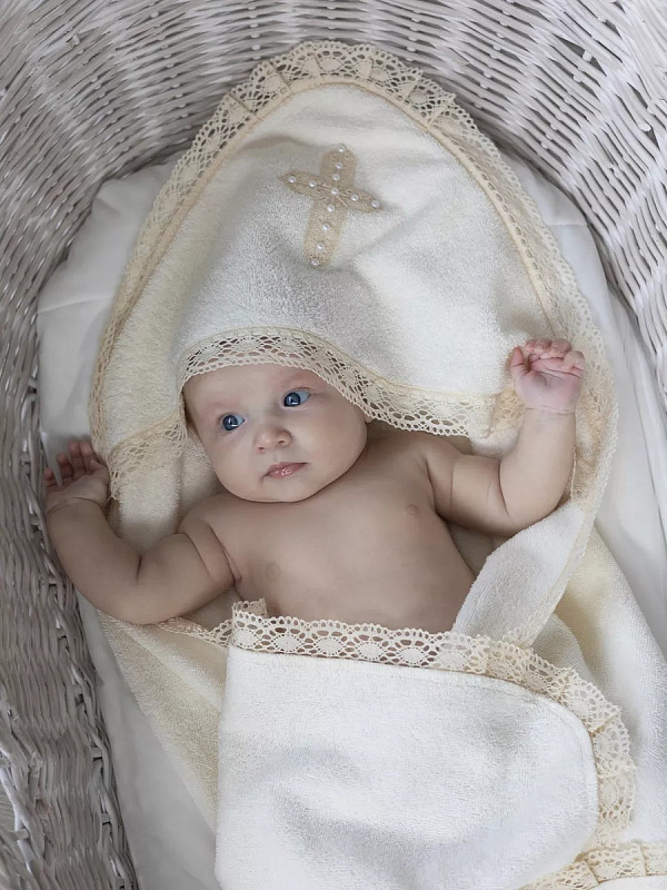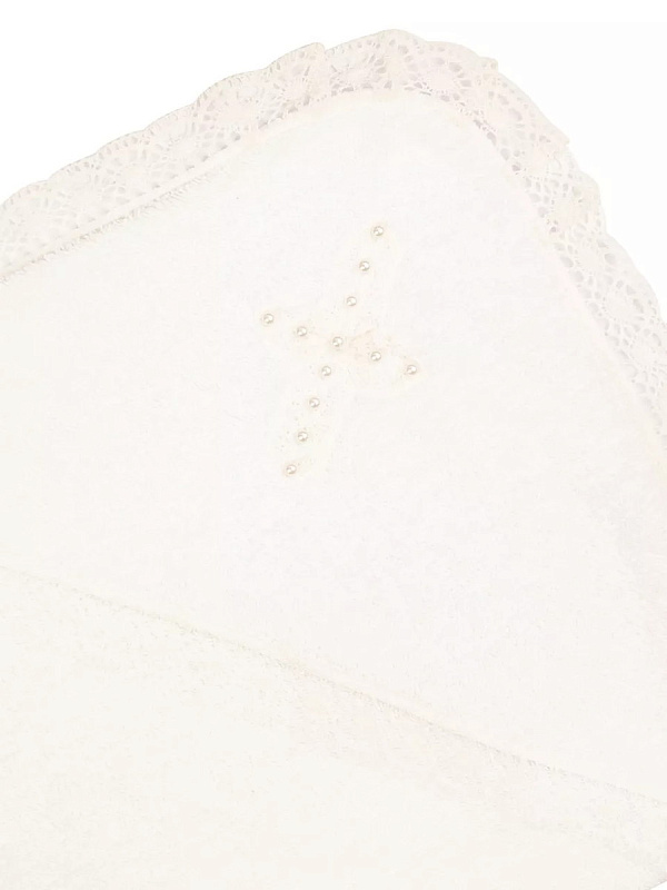 Роскошное полотенце с уголком для крещения выполнено из махрового полотна. Отделка из изящного кружева. Капюшон-уголок украшен крестиком из кружева с жемчужинками. 100% Хлопок
