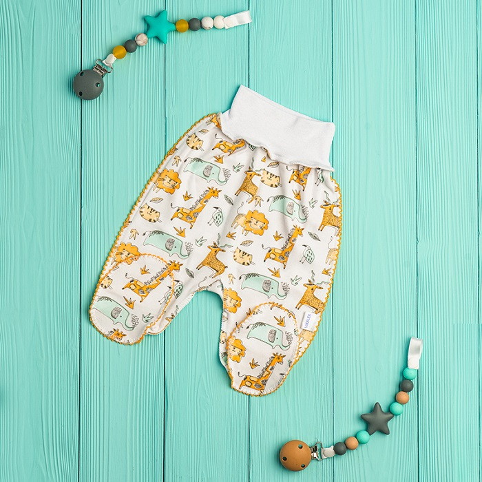 Трикотажные ползунки с широкой резинкой на поясе не стесняют движений. Швы наружу не придают дискомфорта. Ткань хорошо пропускает воздух благодаря натуральному составу. Модель украшена рисунком.