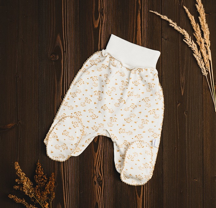 Трикотажные ползунки с широкой резинкой на поясе не стесняют движений. Швы наружу не придают дискомфорта. Ткань хорошо пропускает воздух благодаря натуральному составу. Модель украшена рисунком.