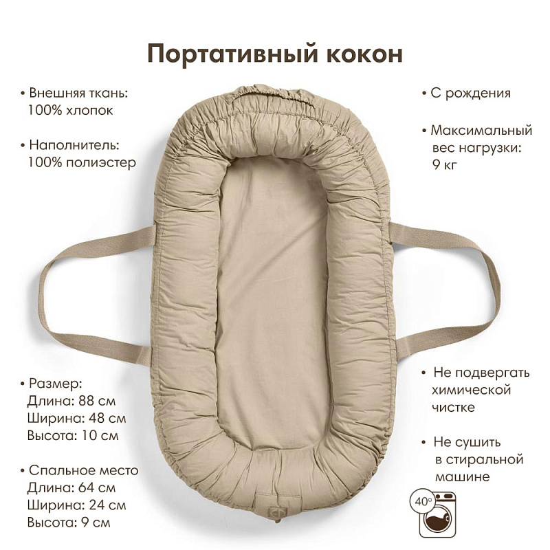 Верхняя часть кокона изготовлена из 100% хлопка и легко снимается, её можно стирать в машине. Мягкий поролоновый матрас устанавливается поверх прочной легкой пластины и в сочетании с очень длинными ремнями позволяет легко и безопасно перемещать кокон с места на место.