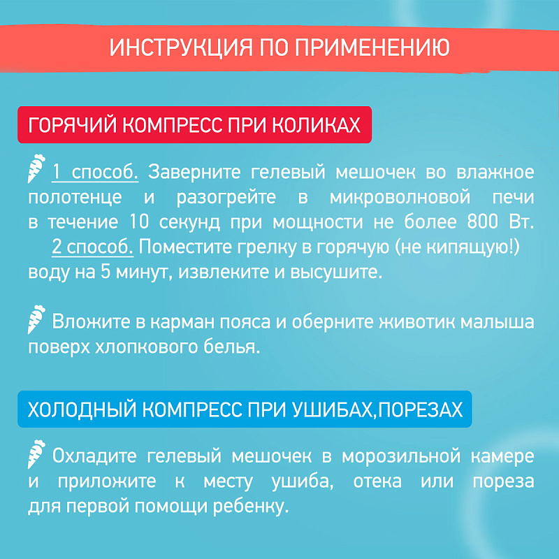 текстиль – 100% лавсан, грелка – ПВХ, внутри – глицерин 25%, карбоксиметилцеллюлоза натрия 5%, вода 70%