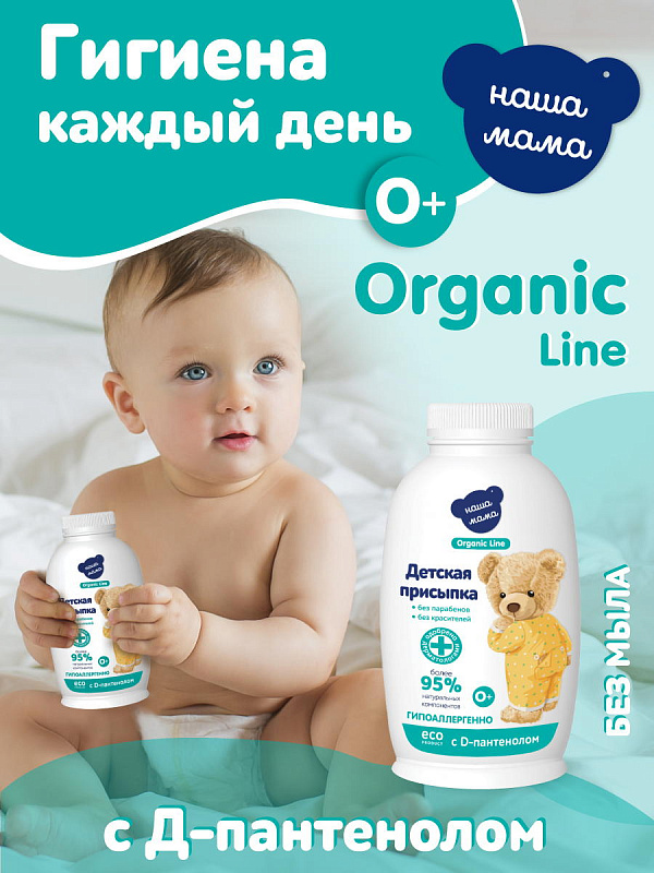 "Наша мама Organic Line" – серия ECO-косметики для новорожденных от компании "Наша мама". При создании серии учитывались высокие требования к натуральности, безопасности и качеству продукта созданного для новорожденных. Для каждого из продуктов серии "Наша Мама Organic line" создана своя, сбалансированная формула ECO-формула, на основе высококачественных и только натуральных ингредиентов. В основе составов ECO-косметики серии "Наша Мама Organic line" используются только натуральные отвары лечебных трав и натуральные масла. Составы косметики обогащены Аллантоином, Д-пантенолом, Бисабололом, витаминными комплексами, ионами серебра. Средства косметической серии "Наша мама Organic Line" не содержат SLS, парабенов, силиконов, красителей и агрессивных антимикробных компонентов. Средства гипоаллергенны и проверены клинически.