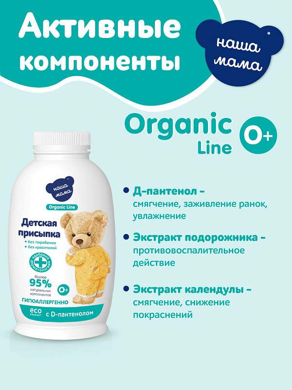 Специальная органическая эко-формула детской присыпки серии "Наша мама Organic Line", с натуральными экстрактами календулы и подорожника создана на базе талька ультратонкого помола. Для бережного ухода за чувствительной кожей малыша, присыпка с максимальной степенью абсорбции отлично впитывает влагу, поддерживает естественный уровень pH, предохраняет от трения, обладает противовоспалительными свойствами. Присыпка проверена клинически и рекомендована для регулярного ежедневного применения для профилактики появления покраснений и раздражений на чувствительных участках кожи.