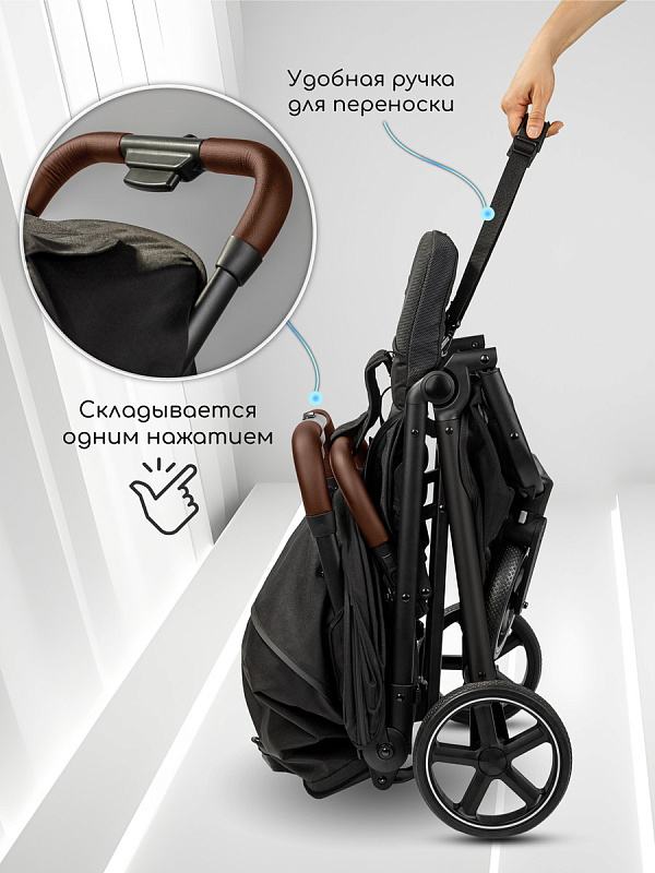 Для удобства переноски есть специальный ремешок, который позволяет вам легко взять коляску с собой. В комплекте с коляской идет теплый чехол на ножки, москитная сетка и дождевик.