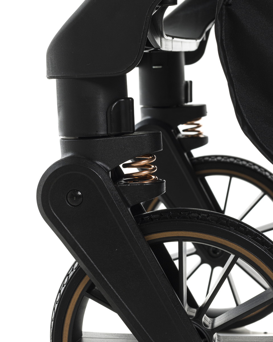Коляска легкая, маневренная и отлично управляется даже одной рукой и отличается более мягким ходом, благодаря амортизации. Все колеса из EVA, а передние колеса поворотные на 360 градусов с системой амортизации «Anti Shock» (поглощение колебаний), обеспечивают мягкий и плавный ход коляски, а также разворот ее в любую сторону, даже на неровной дороге, при желании их можно заблокировать для движения прямо. Тормозная система EASY STOP. Регулируемая родительская ручка в 4 положениях позволяет настроить высоту ручки под рост родителей, что обеспечивает более комфортное управление коляской.