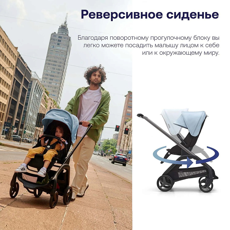 Bugaboo Dragonfly одинаково удобна как для родителей, так и для детей. Прогулочный блок, который разработан для ребенка до 22 кг, можно установить в двух положениях — лицом к родителям или к миру. Просторное сиденье оснащено регулируемыми спинкой и подставкой для ног, поэтому вы всегда можете создать идеальный угол для сна малыша.