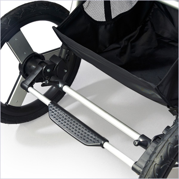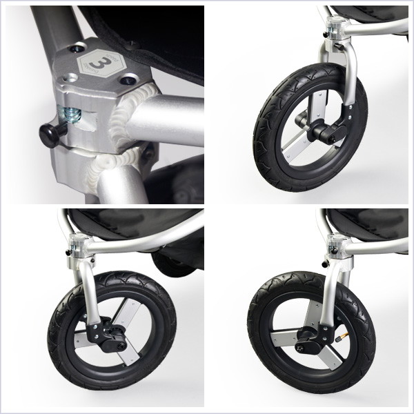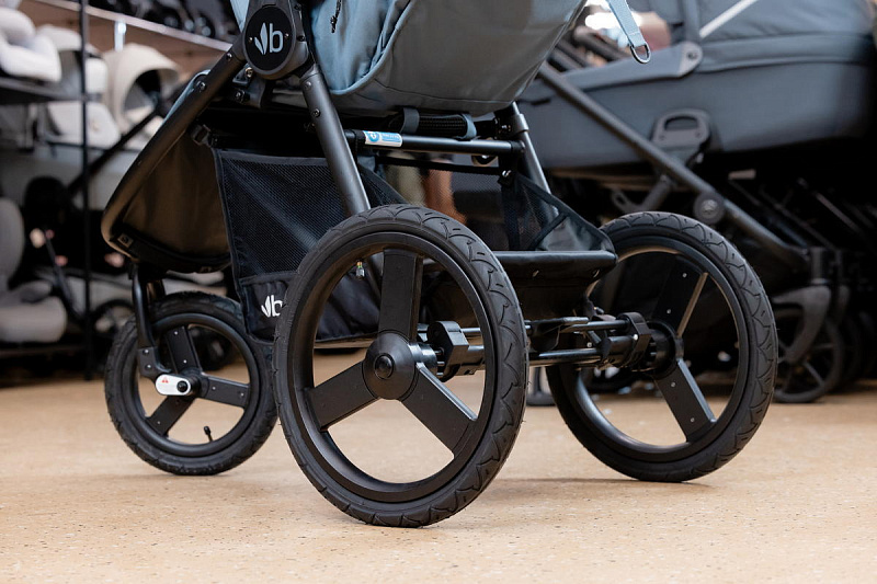- Система трехколесная, при этом задняя пара колес увеличенного диаметра, а вот переднее чуть поменьше и имеет поворотный механизм, который позволяет ему вращаться вокруг оси и гарантировать для Bumbleride Speed отличную маневренность и более простое, быстрое управление.