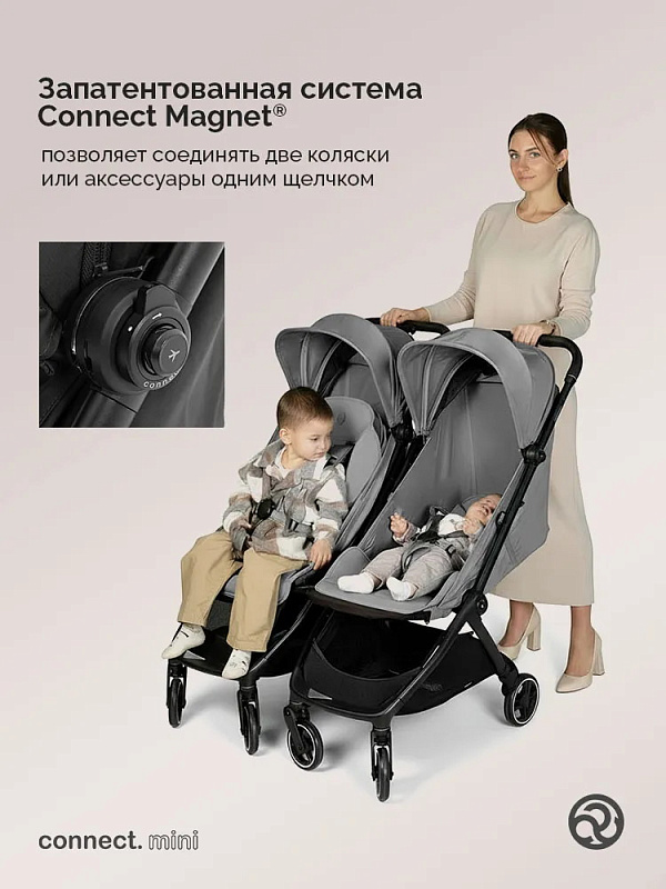 - Благодаря двойной конфигурации Connect Mini — коляска для двойни, которая проходит через любой дверной проем, поскольку ее можно за секунду разложить на две отдельные коляски шириной не более 45 см каждая.