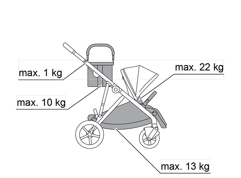 • Максимальная нагрузка на коляску, включая сиденье, люльку или автокресло, корзину для покупок и подстаканник не должен превышать 57,5 кг,