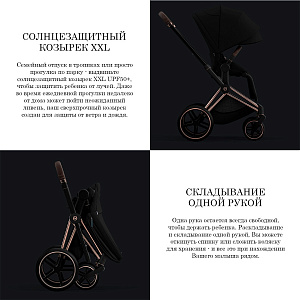 Коляска Cybex Priam IV также обеспечивает надежную защиту от солнечных лучей и осадков. Она оснащена огромным капюшоном размера XXL, который прекрасно защищает от УФ-излучения. Капюшон имеет дополнительную секцию на молнии, под которой расположено смотровое окошко. Это позволяет вам наблюдать за малышом, не открывая капюшон полностью. Кроме того, в комплекте с коляской идет фирменный дождевик, который обеспечивает защиту от осадков во время прогулок в дождливую погоду.