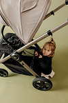 - Компактное складывание. Шасси складывается вместе с прогулочным блоком. Боковой замок-фиксатор гарантирует, что коляска не раскроется при переноске или погрузке в багажник.