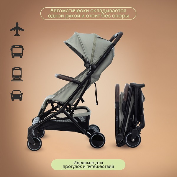 - Легкая конструкция (всего 8,4 кг) и автосложение одной рукой делают ее идеальным выбором для родителей, которые ценят каждую минуту. Вам не придется беспокоиться о том, как уместить коляску в багаж — KIMI всегда под рукой! Габариты коляски в сложенном виде позволяют легко разместить ее в самолете (44,5 х 22 х 50 см).