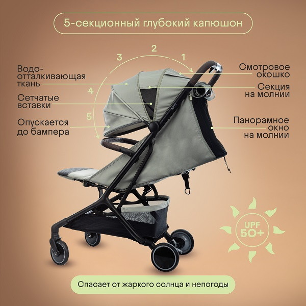- Прочная износостойкая ткань с водоотталкивающей пропиткой и защитой от солнца UPF 50+ гарантирует безопасность вашего малыша в любых условиях.