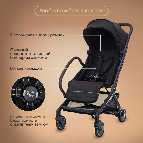 - С черной рамой и ручками из ЭКО-кожи, коляска KIMI не только функциональна, но и стильно выглядит. Она станет ярким акцентом в вашем повседневном образе, подчеркивая ваш вкус и заботу о комфорте вашего ребенка.