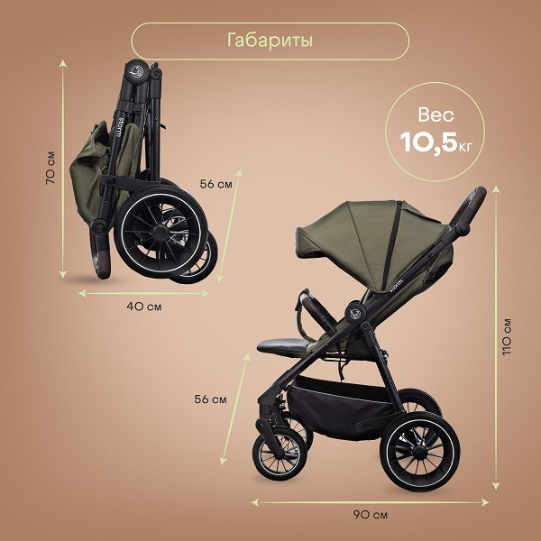 - С весом всего 10,5 кг и компактными размерами в сложенном виде (40 x 56 x 70 см), эта коляска легко помещается в багажник вашего автомобиля или в ограниченное пространство. Диаметр передних (20 см) и задних (28 см) колес обеспечивает отличную проходимость по любым поверхностям — от городских тротуаров до парковых дорожек.