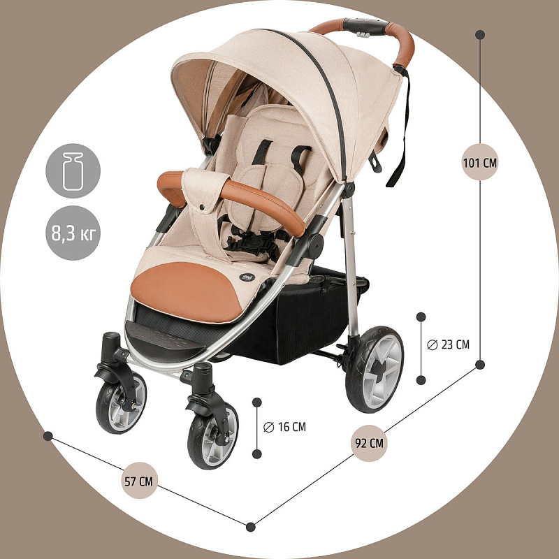 Количество колёс, размеры колес4; диаметр задних колес: 23 см; диаметр передних колес: 16 см