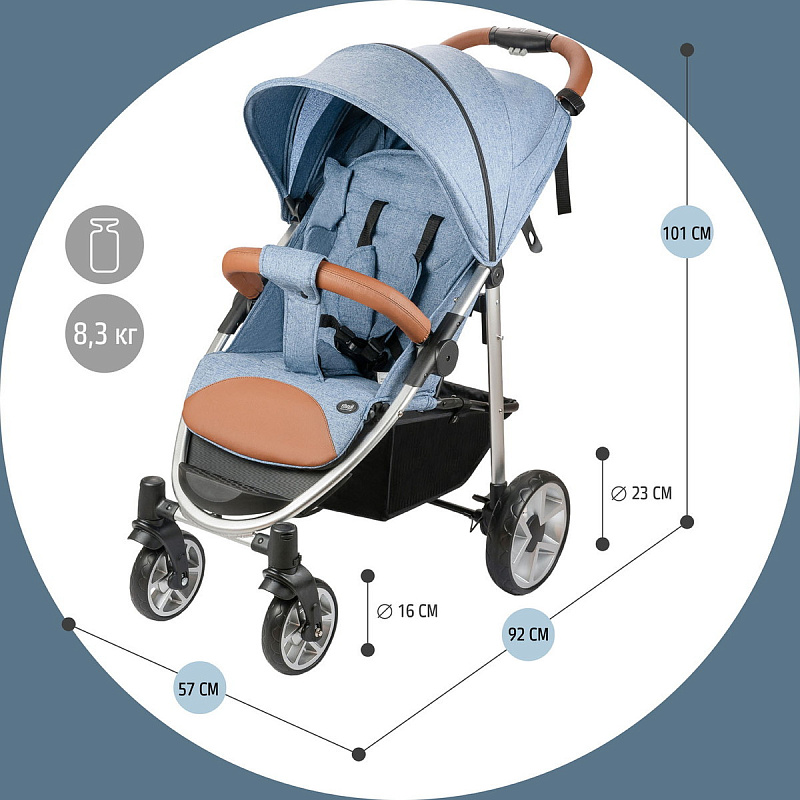 Количество колёс, размеры колес4; диаметр задних колес: 23 см; диаметр передних колес: 16 см