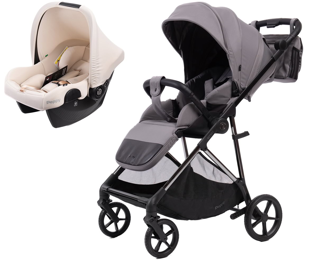 Прогулочная коляска Peppy Amici с автокреслом Rise Milk Grey рама Black Chrome