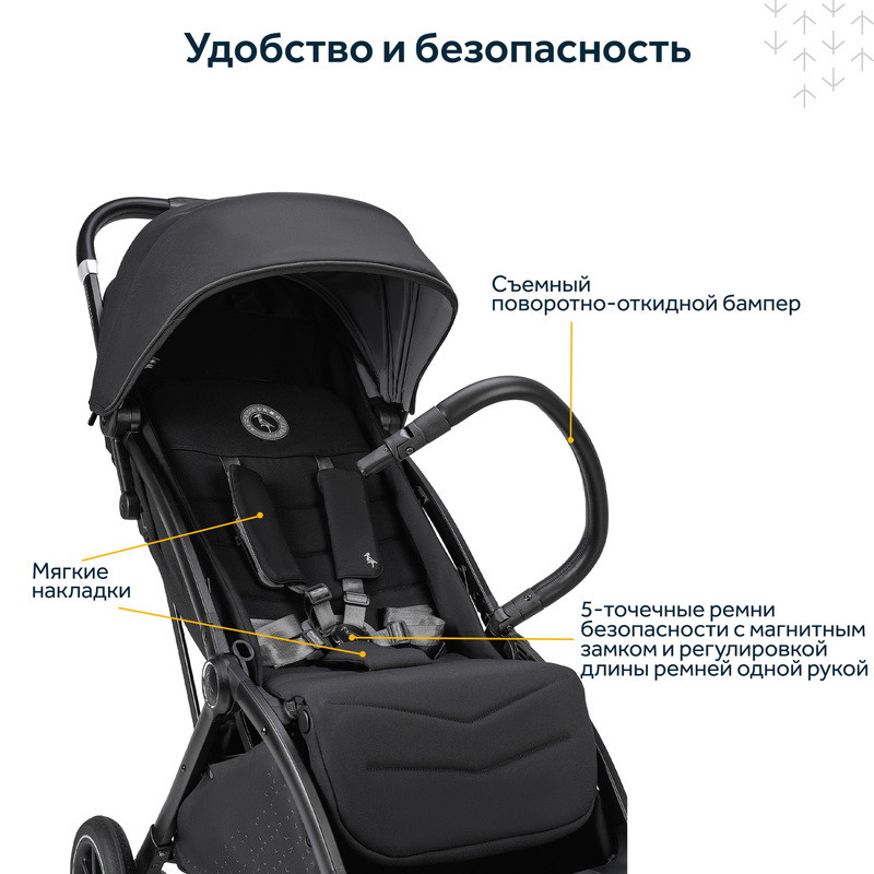 Поворотно-откидной бампер из премиальной веганской экокожи облегчает посадку и высадку ребенка.