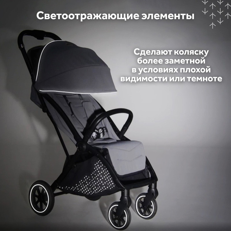 Светоотражающие элементы на капоре, по всей поверхности корзины в виде лапок аиста и на колесах обеспечивают дополнительную безопасность в темное время суток.