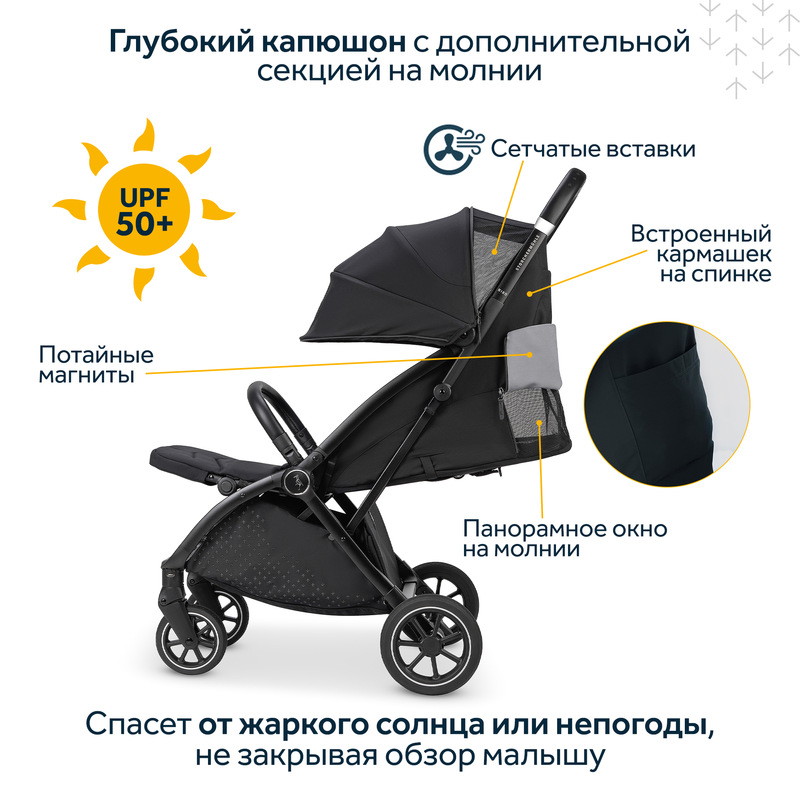 Панорамное вентиляционным окном на спинке капора на молнии и потайных магнитах для комфортного отдыха малыша.