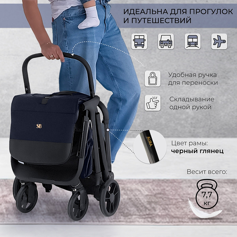 Лёгкая прогулочная коляска Aura- стильная, маневренная, легкая коляска, которая станет незаменимой помощницей в путешествиях и дальних поездках.