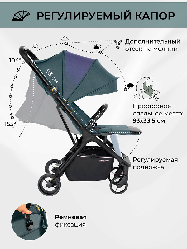 • Глубокий регулируемый капюшон с сеткой защищает от солнца и ветра, позволяя вашему ребенку наслаждаться спокойным сном в любых условиях.