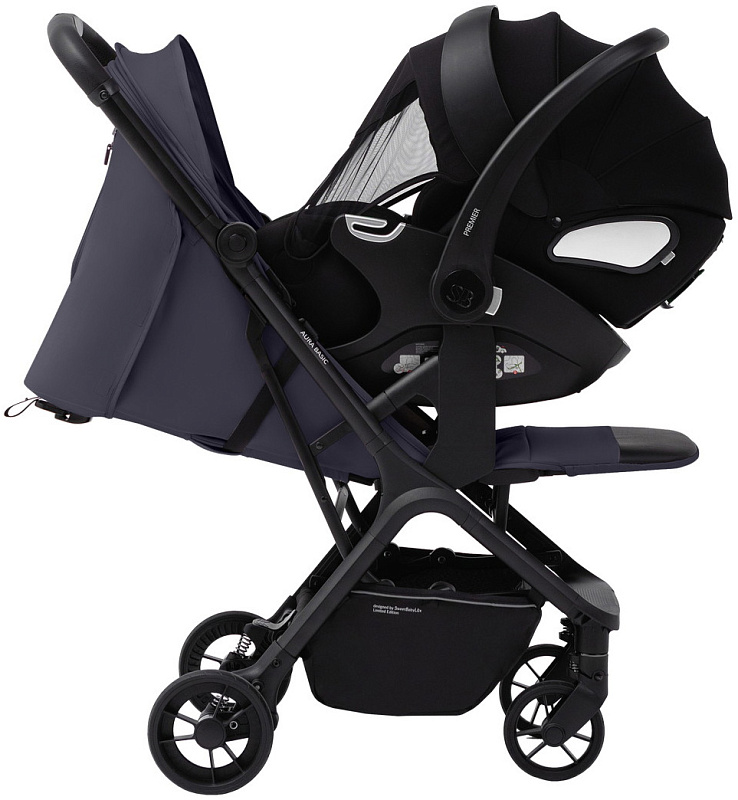 Коляска SBL Aura Basic привлекает внимание своим дизайном: затемненная хромированная фурнитура, черная матовая алюминиевая рама и амортизационные пружины придают ей строгий и стильный вид. Пятиточечные ремни безопасности обеспечивают надежность и спокойствие во время прогулок.
