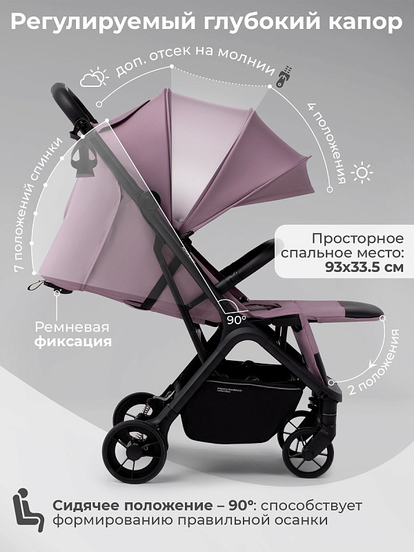 • Глубокий регулируемый капюшон с сеткой защищает от солнца и ветра, позволяя вашему ребенку наслаждаться спокойным сном в любых условиях.