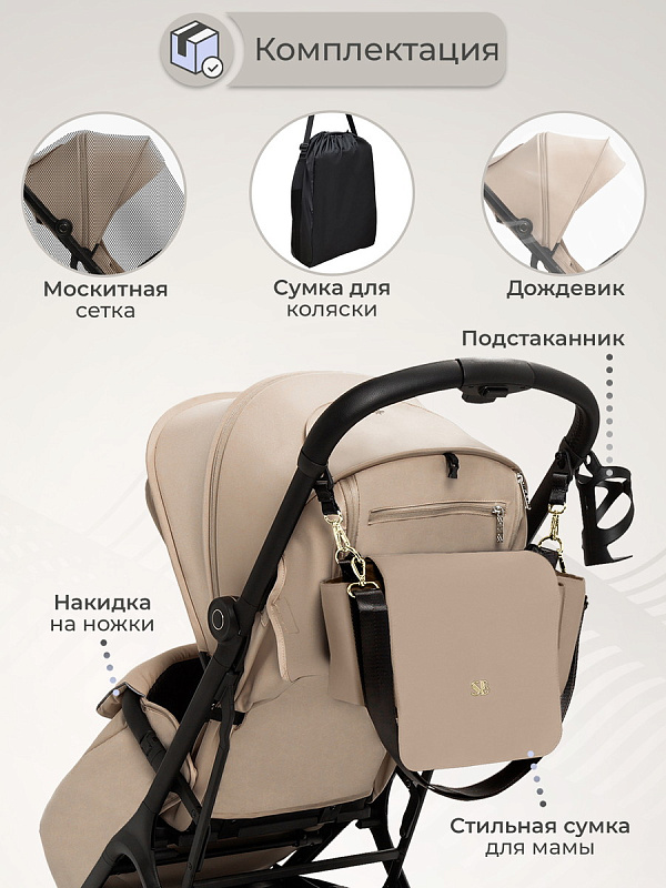 Богатая комплектация: В комплекте вы найдете все необходимое: накидку на ножки, москитную сетку, дождевик, сумку для коляски и супер-сумку для мамы, а также подстаканник для вашего любимого напитка — теперь прогулки станут еще более комфортными и приятными!