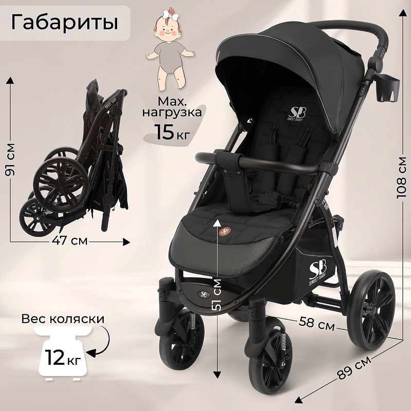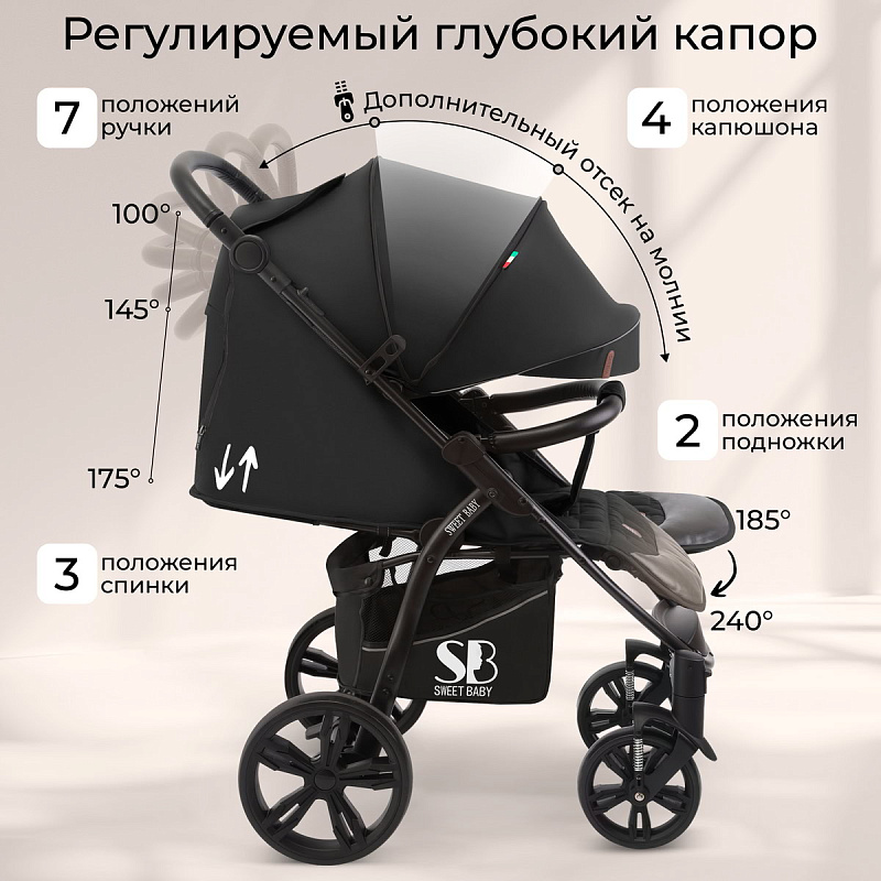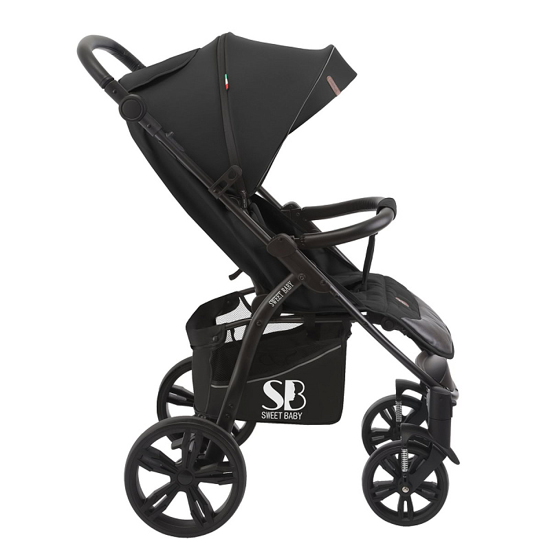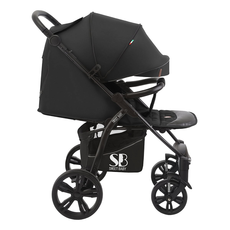 Sweet baby Carisma – новая всесезонная прогулочная коляска итальянского бренда, созданная для безусловного комфорта в путешествиях и прогулках любого формата детей в возрасте от 6 месяцев и до 3х лет . Отличительной особенностью коляски является горизонтальное положение для беззаботного сна и комфортная механическая регулировка спинки (3 положения). Верхняя часть коляски выполнена из инновационного материала с повышенной износостойкостью и устойчивого к выцветанию. Компактная система складывания коляски вместе с сиденьем, при которой рама занимает устойчивую вертикальную позицию, надежно фиксируется держателем, сохраняется гигиеничность ручки и текстильной обивки. Большие задние колеса легко преодолевают неровности грунта и препятствия загородных дорог, передние позволяют маневрировать в сложных городских условиях и являются полноповоротными, что значительно облегчает управление коляской. Функция блокировки передних колес удобна при передвижении по снегу и грязи. В комплекте есть дождевик и подстаканник